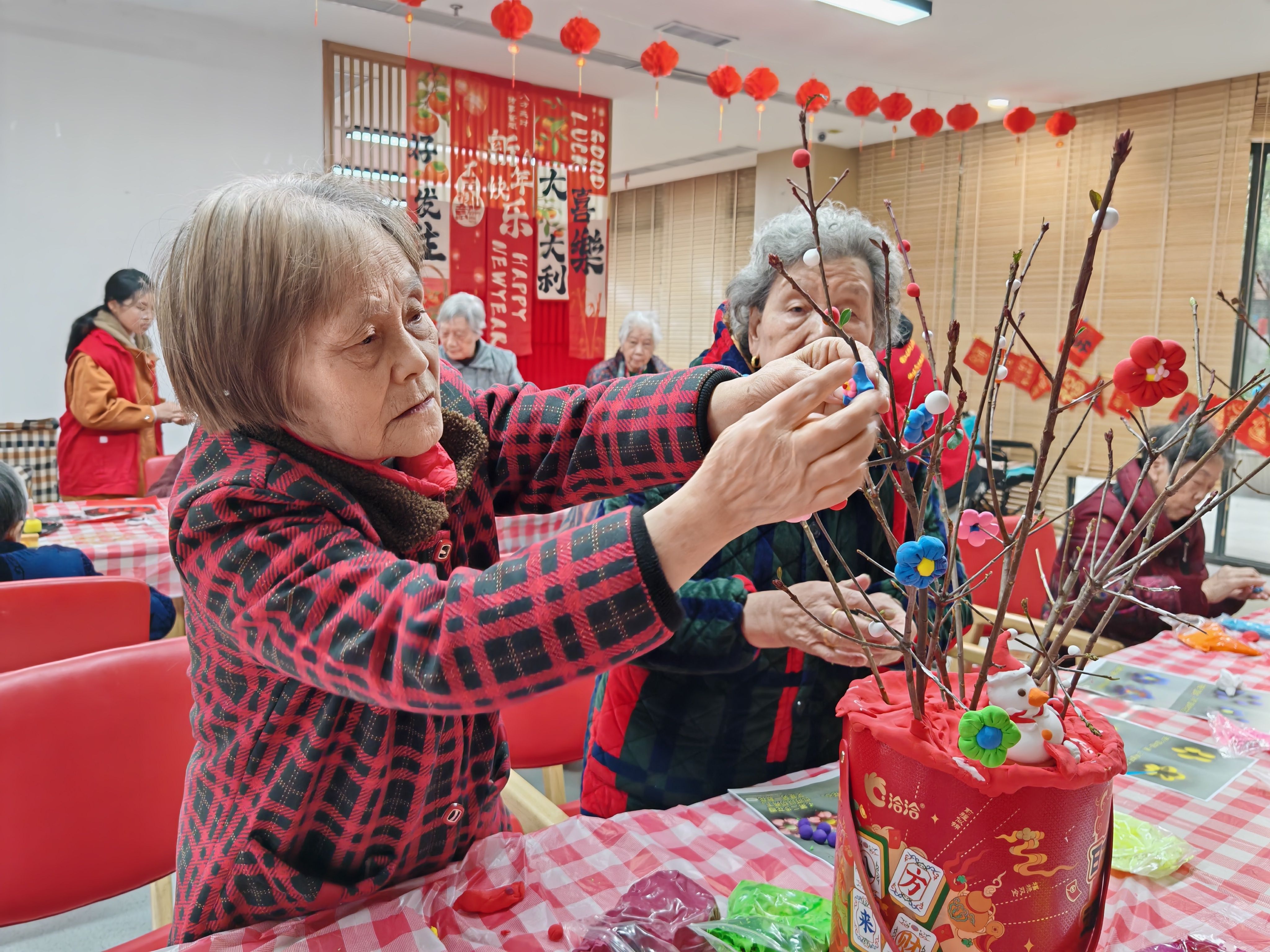 颐康养老中心组织长者写春联、贴福字,为养老院送上蛇年的第一份美好祝福。家庭团餐、年味特色菜品、拜年送福活动,让长者体验到家的浓浓年味。