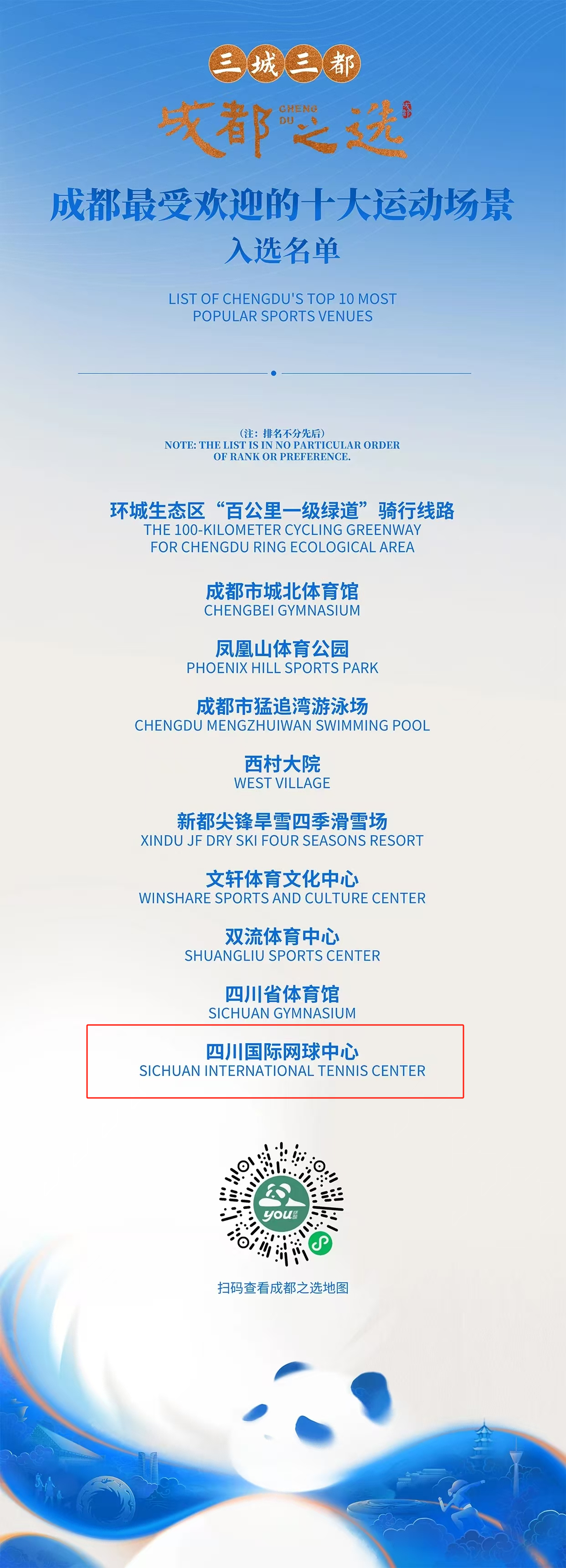 近日,在成都市“三城三都”品牌建设评选中,四川国际网球中心凭借卓越的硬件设施、广泛的群众基础和显著的社会效益,成功入选“成都最受欢迎的十大运动场景”。荣获此称号既是对公司长期以来服务体育强省、助力成都世界赛事名城建设的权威认可,也是对企业综合实力与品牌影响力的高度肯定。