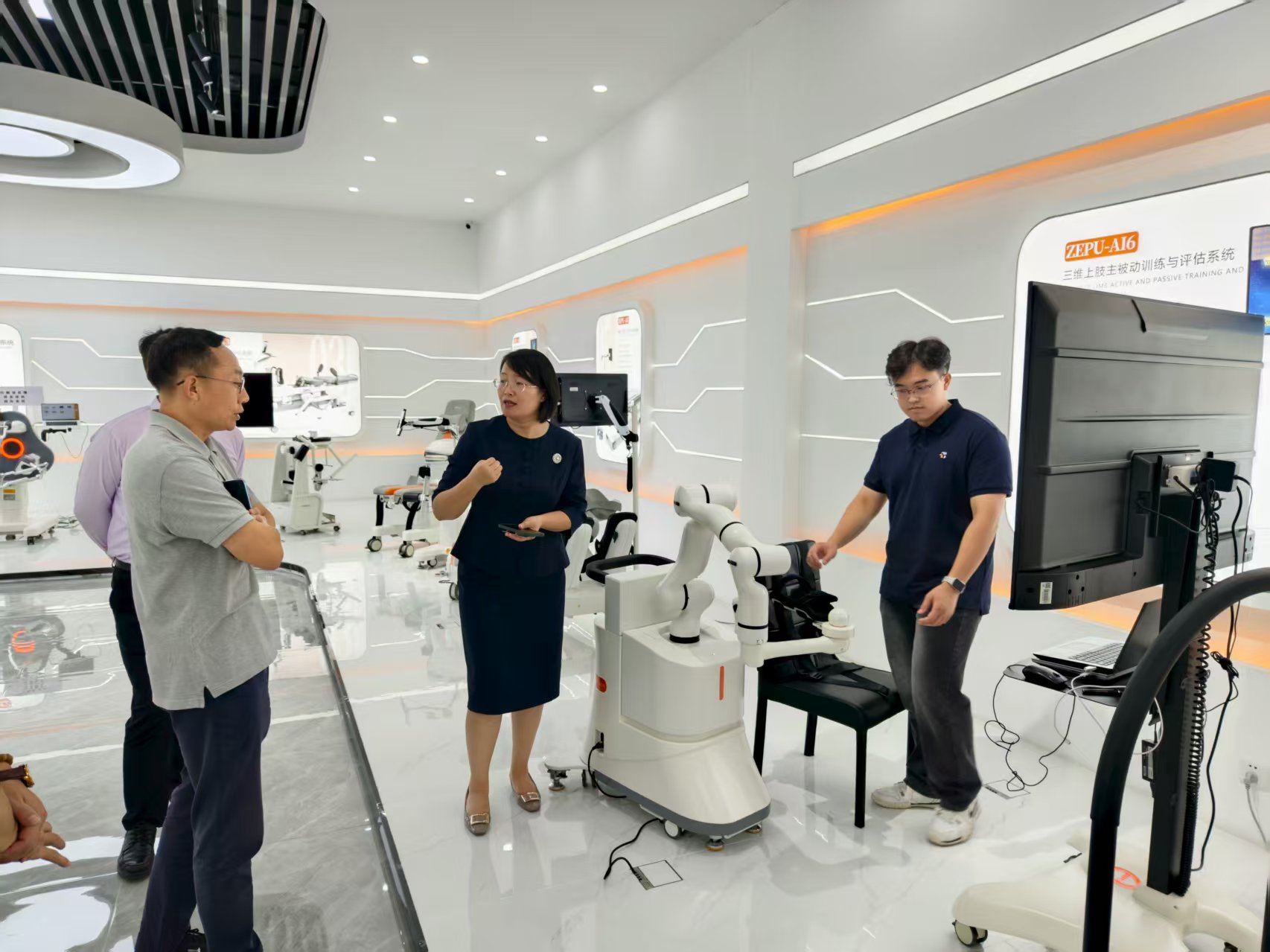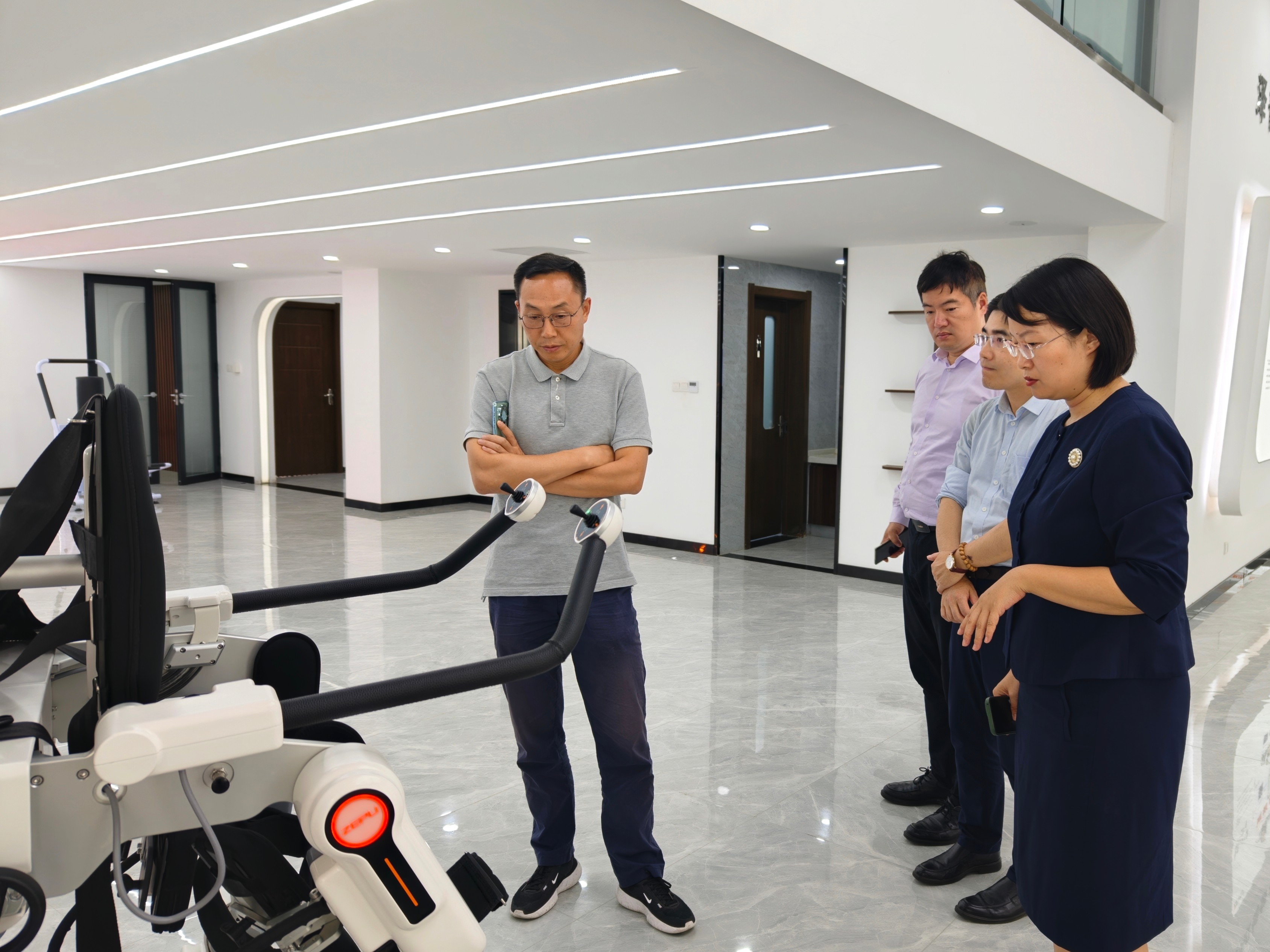 随后,姜涛一行来到国内领先的运动医学康复设备研发生产企业——山东泽普医疗科技有限公司。泽普医疗总部位于山东省高密市,在青岛设立研发创新中心。泽普医疗管理团队对姜涛一行的到访表示欢迎,介绍了国内运动医学康复设备发展方向,公司历史沿革、前沿技术和康复设备租赁的最新政策,引领参观了上肢、下肢、感官触觉等康复设备展厅。姜涛对泽普医疗的接待表示感谢,双方就康复设备的发展及与大健康产业集团业务合作展开座谈交流。