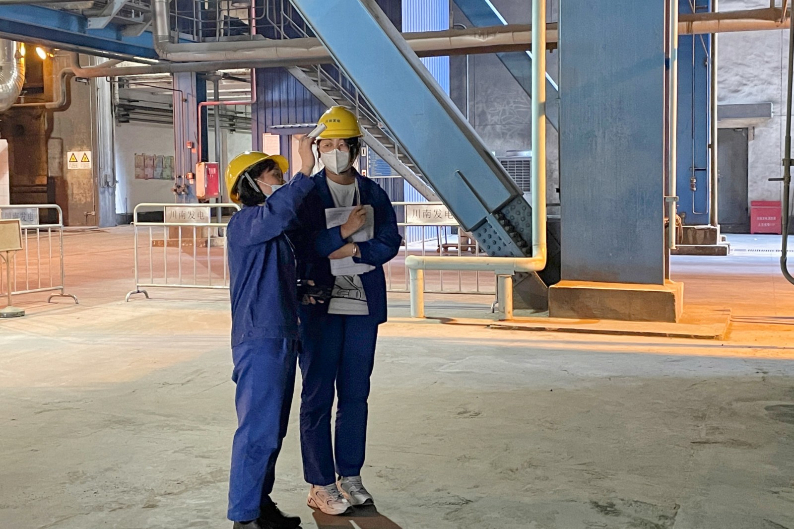 有一次,罗莉所在的四值中班,凌晨0点40分,她像往常一样拿着手电筒巡视捞渣机。当她走到1号炉捞渣机附近时,突然听到“嘎嘎”异响,发现落渣口有一块2米多长的内衬波形板卡在了刮板和护栏之间,受挤压后已严重变形。捞渣机连续运转高效排渣,对机组安全运行很重要。罗莉判断了钢板卡顿方向后,立刻就地临时停止了捞渣机运转,用撬棒使劲儿地敲打波纹板直至松动,让捞渣机恢复正常运行。