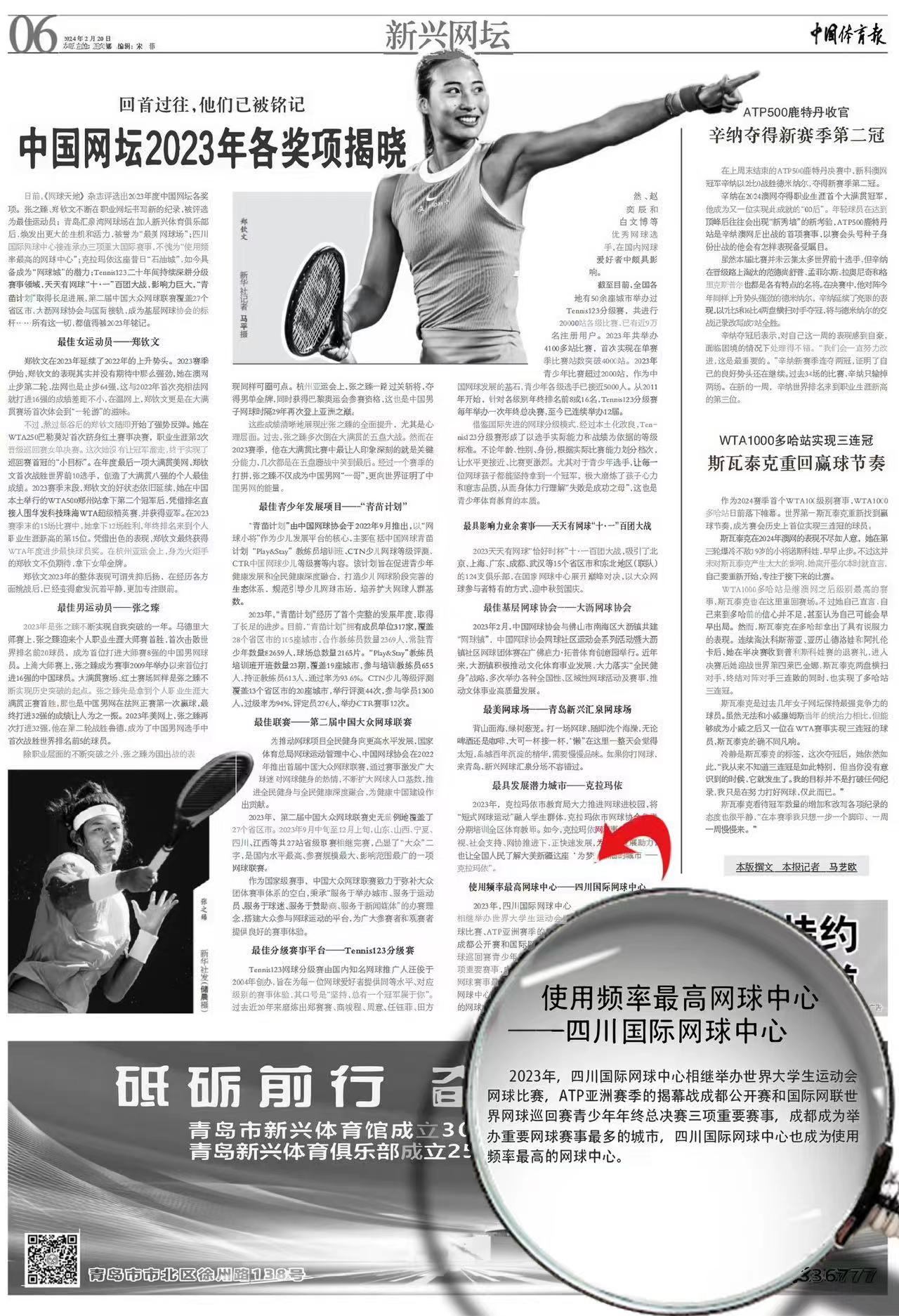2月20日,中国体育报揭晓了中国网坛2023年各奖项,四川国际网球中心以连续举办第31届世界大学生夏季运动会网球比赛、ATP亚洲赛季揭幕战成都公开赛和国际网联世界网球巡回赛青少年年终总决赛三大国际重要赛事和众多国际国内其它赛事而斩获“中国网坛2023年使用频率最高网球中心”头衔,助力成都成为“举办重要网球赛事最多的城市”。