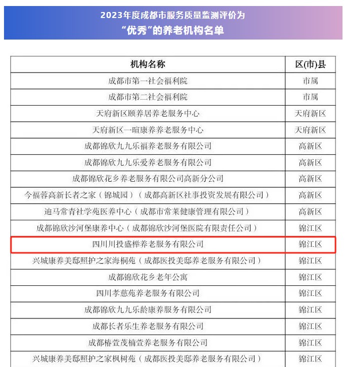 3月4日,川投舒适之家·颐康养老中心荣获2023年度成都市养老机构服务质量优秀等级,是省属国企唯一荣获该殊荣的养老机构。这是“川投舒适之家”养老机构全心全意为长者服务、倾力守护长者颐养晚年的优异成绩,也是“川投舒适之家”养老品牌持续提升社会公信度、品牌知名度、业界认可度的有力体现,更是省属国企积极打造高品质养老机构缓解我省老龄化问题的责任所在。