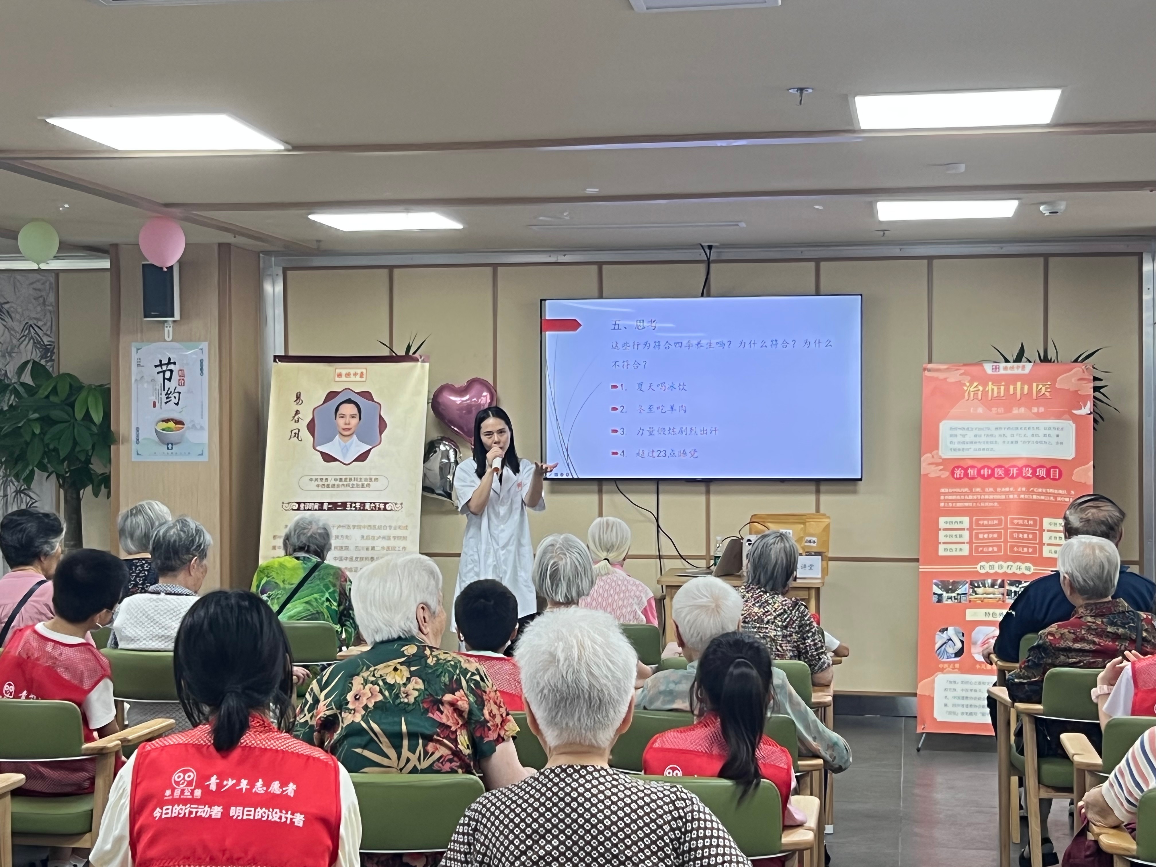 武侯青年志愿者们与治恒中医馆的中医老师以“三伏天健康知识小讲堂”的特色形式,为院内在住长者讲授了夏日防暑降温常识及注意事项。针对长者夏季易发、常见疾病,中医老师们也进行了针对性防护防范措施讲解及演示,让广大长者了解掌握了炎夏如何进行“科学避暑、有效降温”。