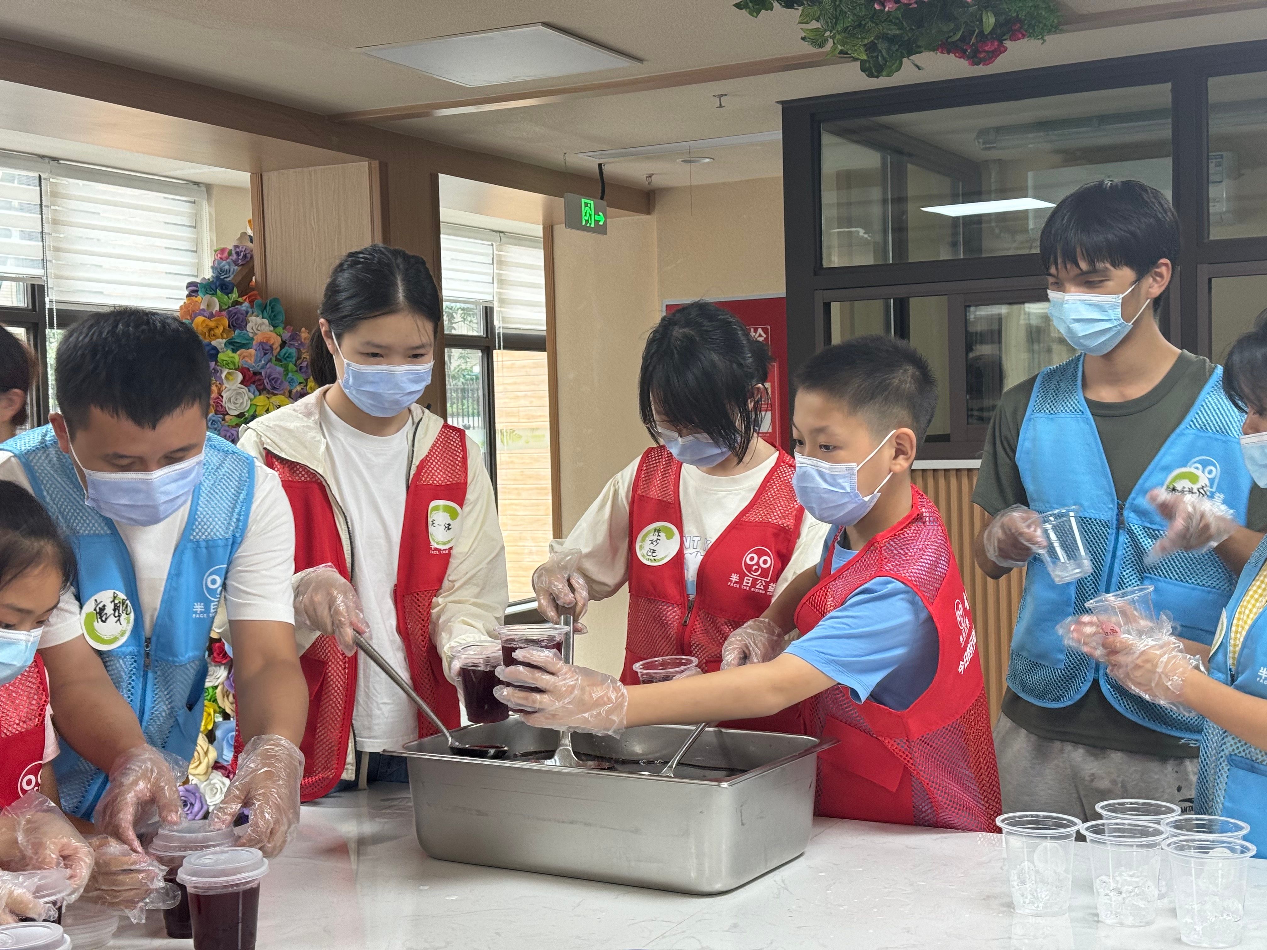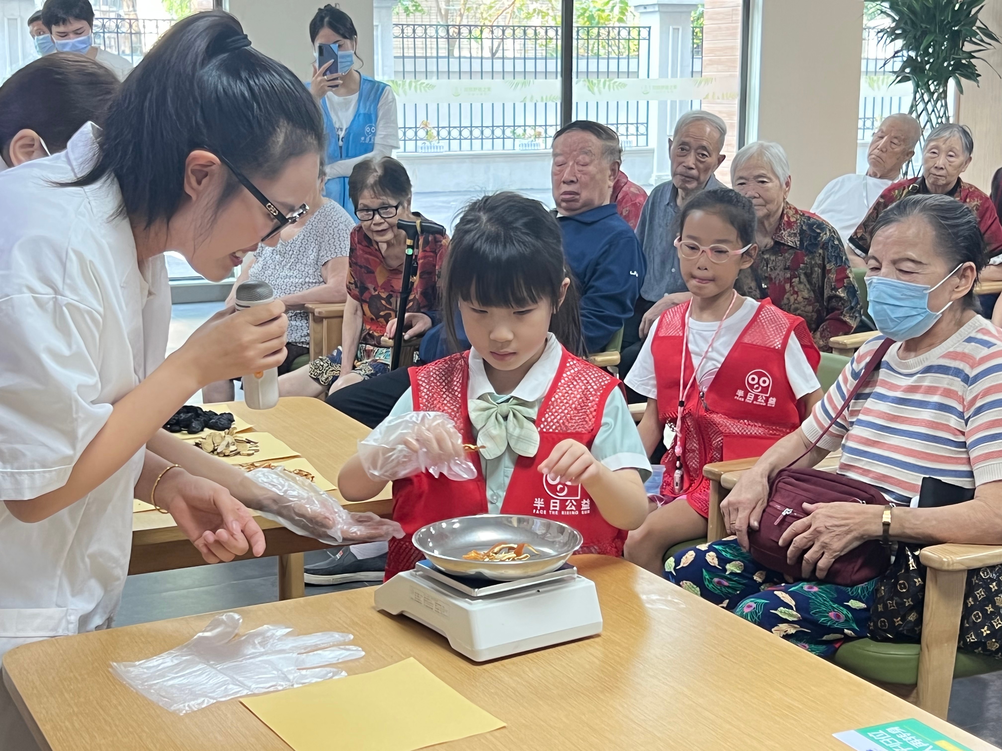 中医老师们向长者们展示了夏季防暑降温的常用中药材,讲解了使用方式、风险事项、药品制作流程等内容。长者们也纷纷动手,体验了对药材进行研磨、称重、烹煮的过程。志愿者们还与中医老师一道,现场制作夏季降温神器——酸梅汤。通过对原材料的认真筛选,对烹饪过程中的严格把控,一杯杯健康、绿色、安全的酸梅汤顺利出炉,为大家带去了一丝清凉和一份关心。