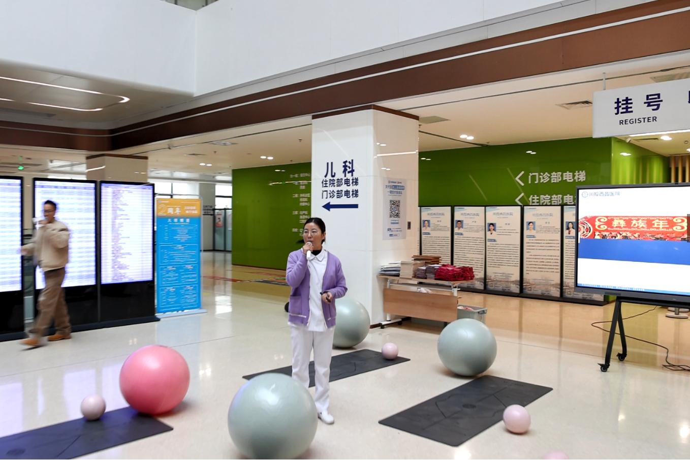 活动最后,妇产科护士彭瑶带领到院就诊的孕产妇、妇女儿童患者进行了现场瑜伽体验,伴随着悠扬舒缓的音乐,大家全身放松,轻缓地伸展身体、缓慢呼吸。期间,彭瑶老师一对一指导每一位女性朋友调节呼吸、用力等,协助完成最佳瑜伽体式,以达到最佳运动效果。
