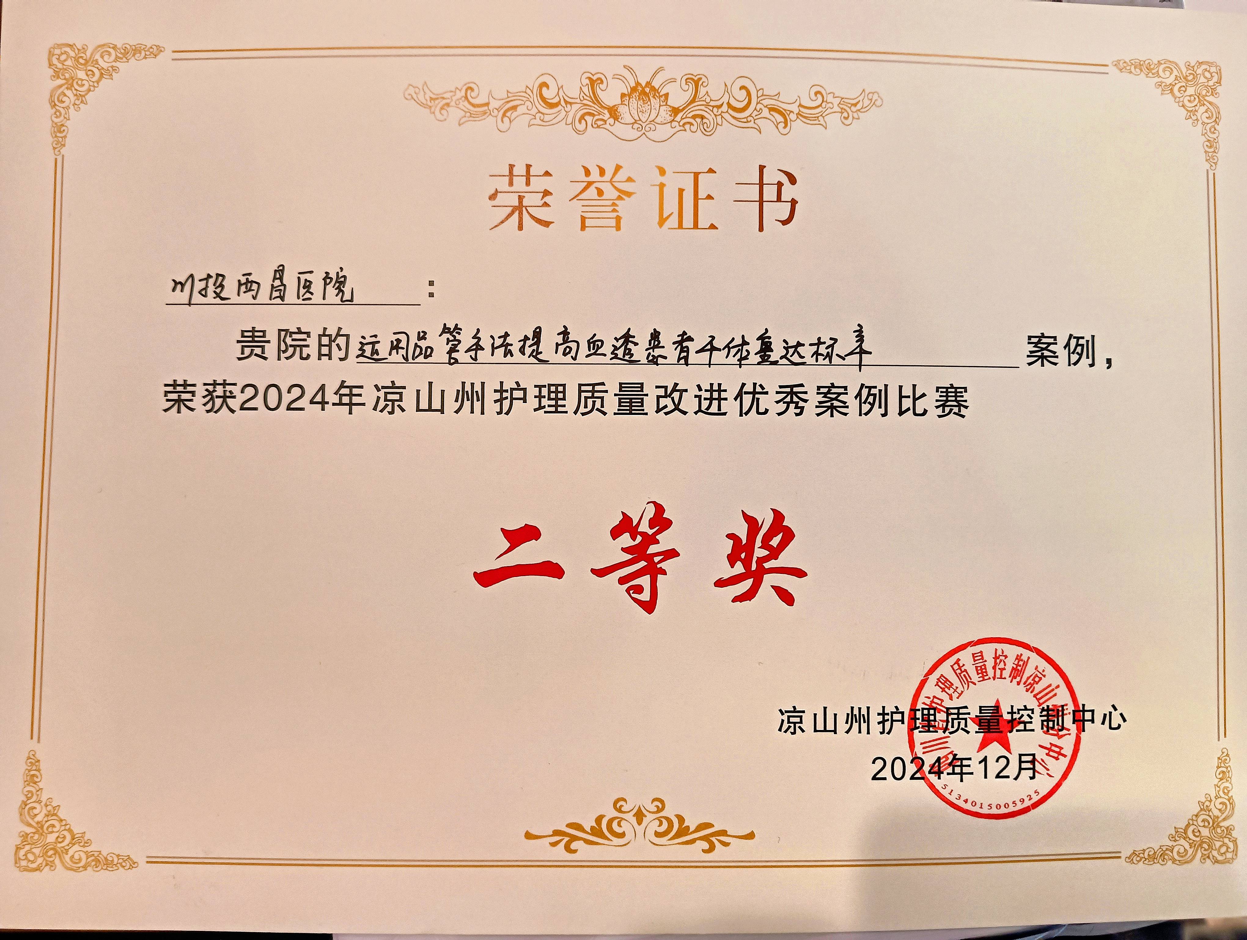12月8日,凉山州护理质控中心举办“凉山州护理质量改进案例比赛”,本次大赛聚焦于改善医疗质量、优化护理服务以及强化患者安全等核心议题,旨在深度挖掘和推广护理领域的创新实践与卓越成果,共有来自凉山州各市(县)护理质控中心选送的17个案例作品参加角逐,川投西昌医院王亚玲、范晓迪的案例作品荣获比赛“二等奖”,可喜可贺!