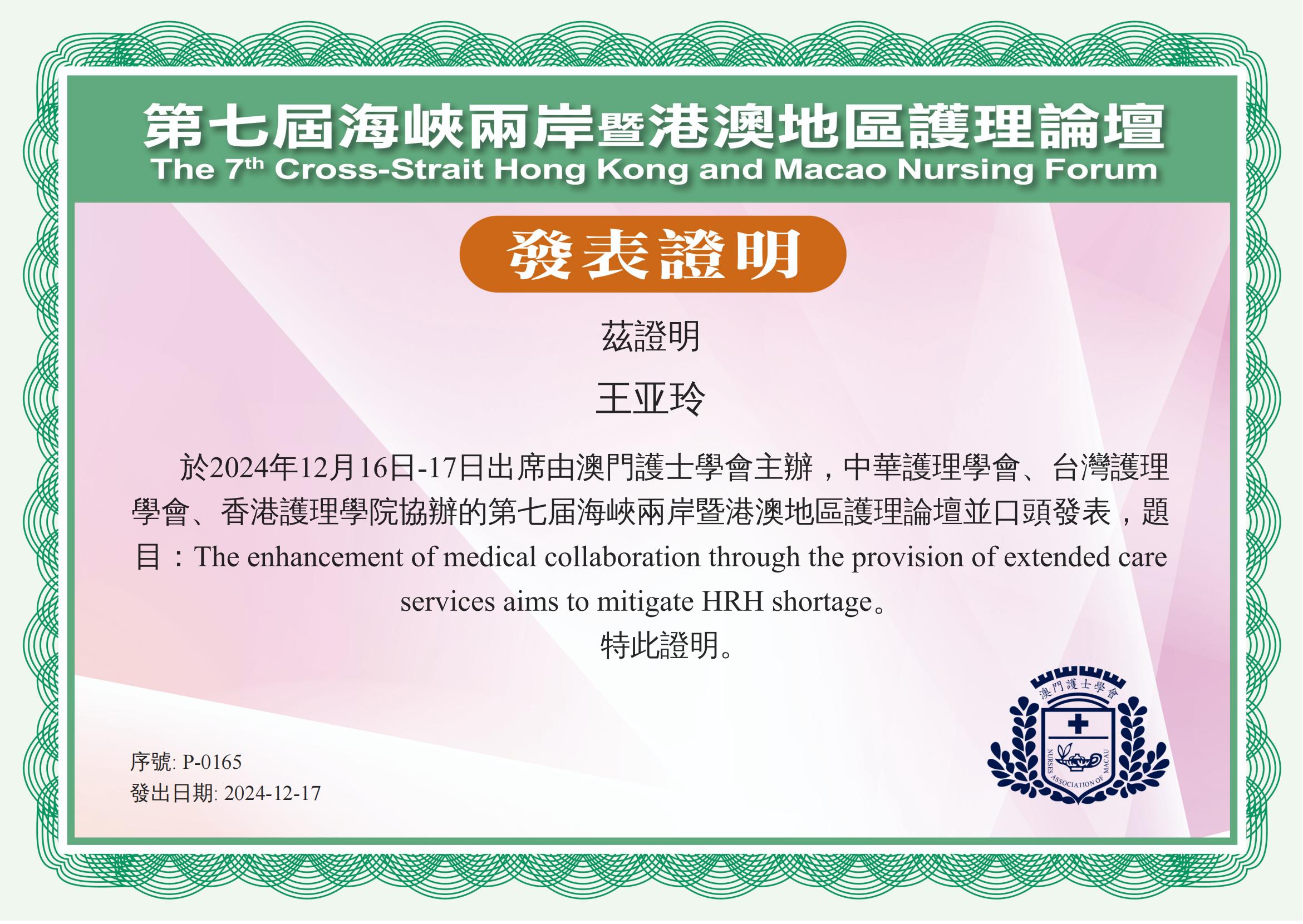 12月16日-17日,由澳门护理学院主办,中华护理学会、香港护理学院和台湾护理学会协办的第七届海峡两岸暨港澳地区护理论坛在澳门隆重举行。今年主题是“我们的护士、我们的未来 - 护理的经济力量”,关注于健康公平、护理实践、护理管理、护理研究与创新及其他健康议题。