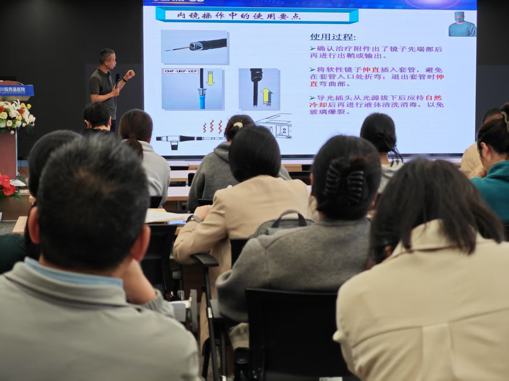 为提高临床科室医护人员对内窥镜操作的熟练度和准确性,确保诊断与治疗的精准性,增强医护人员对内窥镜设备结构与原理的理解,便于日常维护和故障排查,4月24日,川投西昌医院组织开展了内窥镜设备使用操作培训。