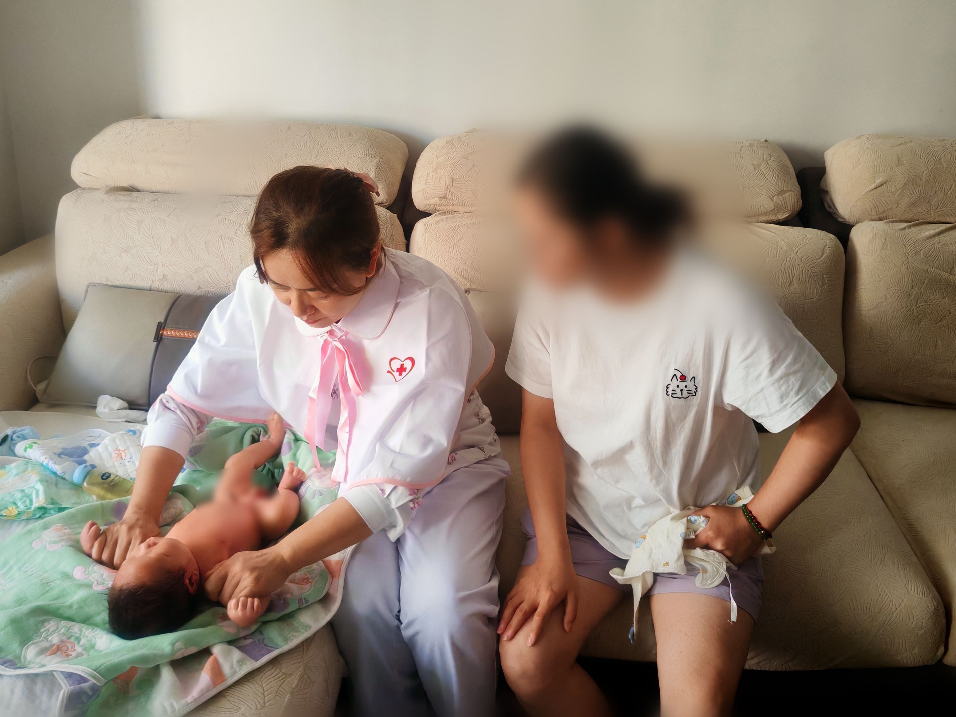 “这么热的天,你们还上门服务,连口水都没喝!”家住长安社区的产妇万分欣喜。护士为她处理伤口时,宝宝正安稳睡在黄疸检测仪旁,家属感慨:“原来孩子黄疸值在安全范围,这下心里踏实多了!”随访过程中,团队还送上“产后关爱礼包”,内含消毒棉签、消毒液及健康宣教折页,细节之处尽显用心。
