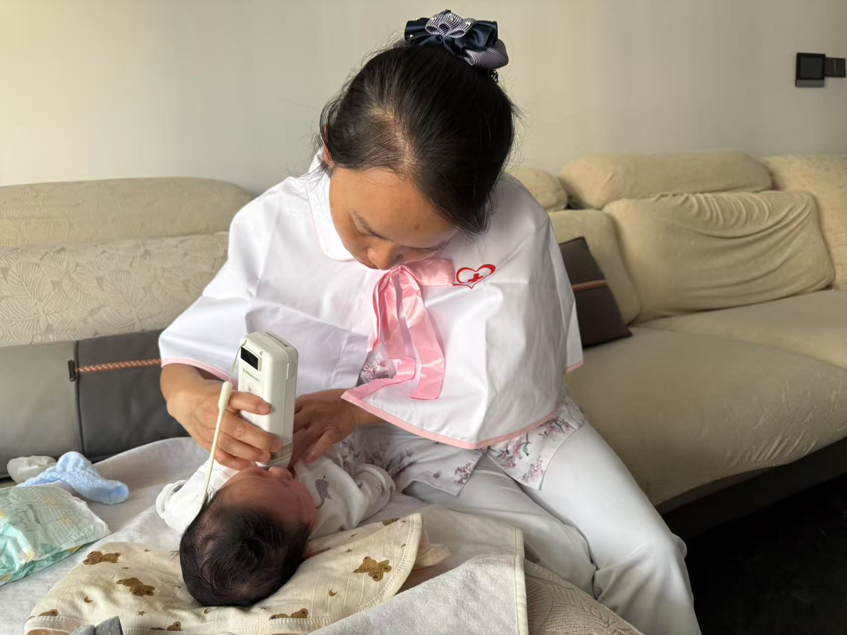 护士轻柔揭开产妇腹部敷料,观察伤口愈合情况,示范科学清洁方法。免费对产妇开展了综合体征监测,针对产妇状态,提供膳食搭配建议、心理疏导等个性化健康指导。同时,使用便携式经皮胆红素检测仪为新生儿免费筛查黄疸值,即时解读数据并指导干预措施。护士们手把手指导家属进行脐部消毒、臀部护理,耐心向家长讲解如何观察新生儿哭声、吸吮力及睡眠质量,帮助家长及时发现异常,为新生儿健康成长保驾护航。