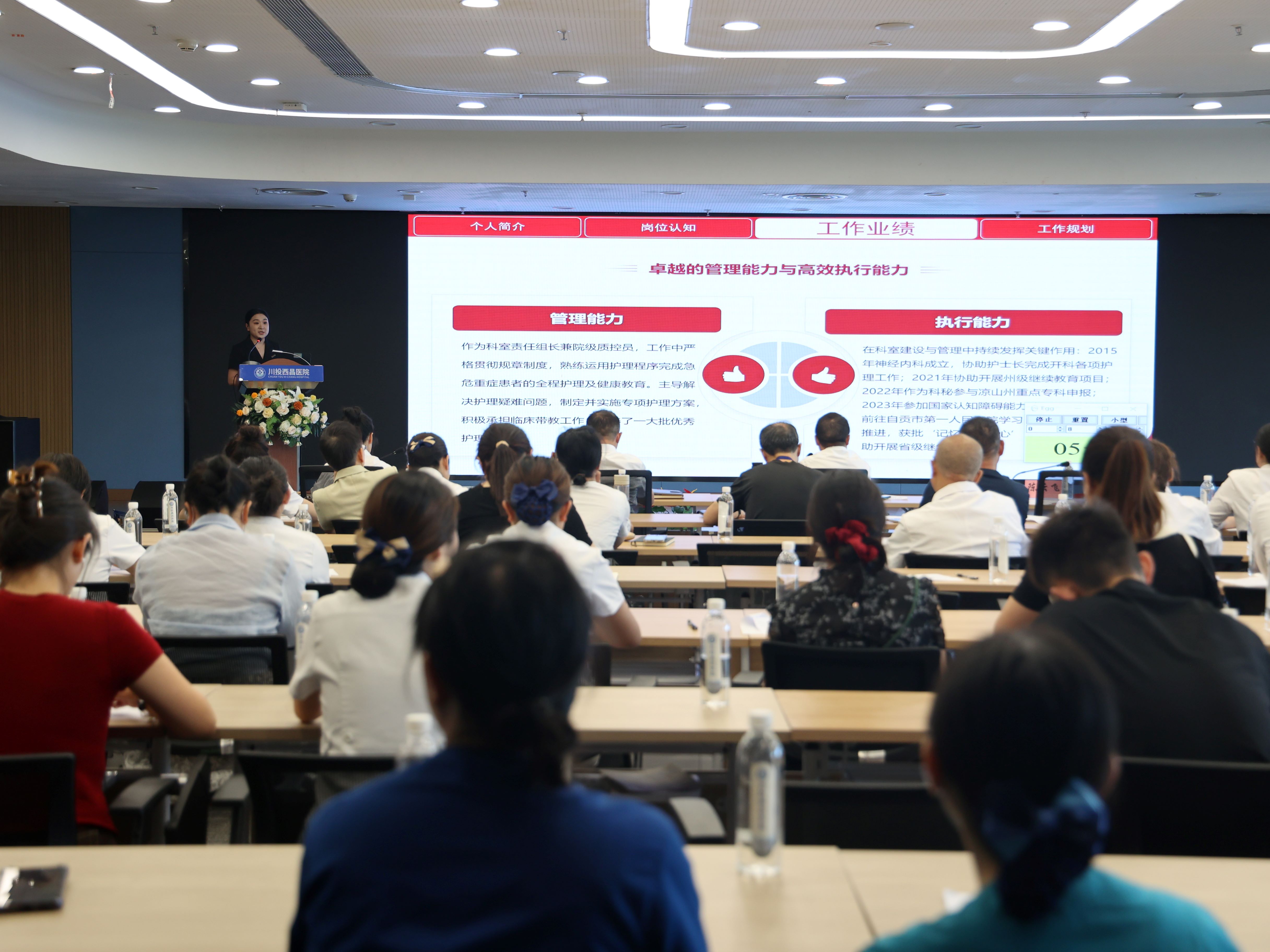 本次竞聘通过公布职位、公开报名、资格审查,共有十名护理人员通过资格审核并参加竞聘测评。在竞聘现场,竞聘人员结合自身工作实际和竞聘岗位特点,从个人优势、岗位认知、工作业绩及规划等内容进行演讲,并回答了竞聘领导小组的现场提问。竞聘过程中,竞聘人员充分展示了从业以来的工作成绩和自身优势,大胆阐述了拟任后的工作思路和创新设想,展现出了较为出色的管理能力和个人才华,获得了现场评委的认可。