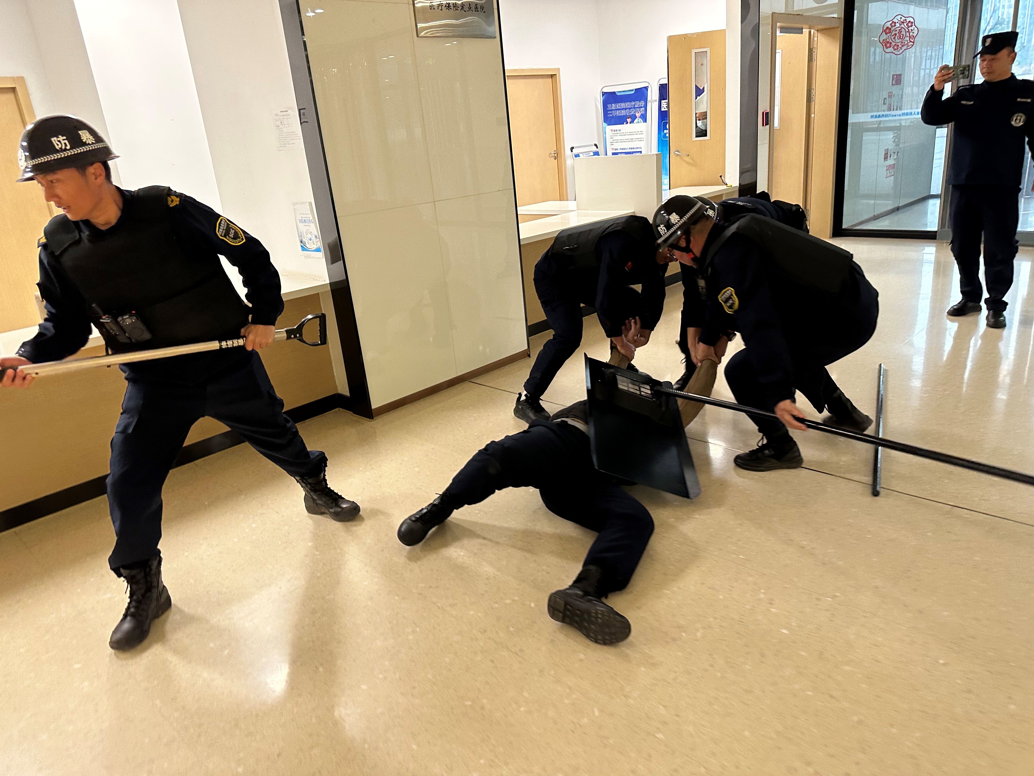 演练模拟川投西昌医院出入院办理处场景:一名暴徒因不满就诊服务,辱骂医护人员后,手持管制刀具砍伤窗口工作人员,并试图继续施暴。出入院办理工作人员立即启动一键报警后,在窗口内进行紧急避险。医院立即启动《突发治安安全事件应急处置预案》及《突发事件院内人员紧急疏散预案》。