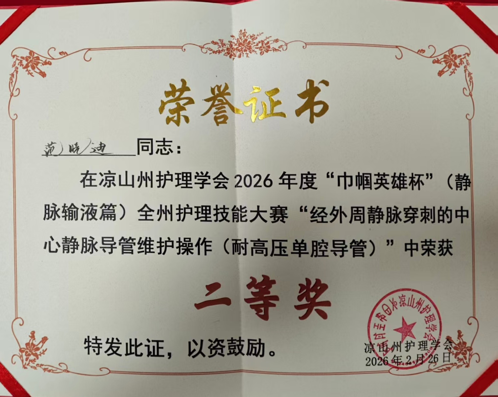 近日,由凉山州护理学会主办的“巾帼英雄杯”全州护理技能大赛(静脉输液篇)在西昌圆满落幕,川投西昌医院护理团队凭借扎实的专业功底、娴熟的操作技能和良好的职业素养,在众多参赛队伍中脱颖而出,斩获多项荣誉,为医院赢得了殊荣!其中,儿科唐祖萍凭借精湛的操作技艺和出色的现场发挥,荣获个人一等奖;肿瘤科范晓迪表现优异,荣获个人二等奖;医院护理团队整体协作默契、发挥稳定,荣获团体二等奖,大家用实力交出了一份亮眼的答卷。