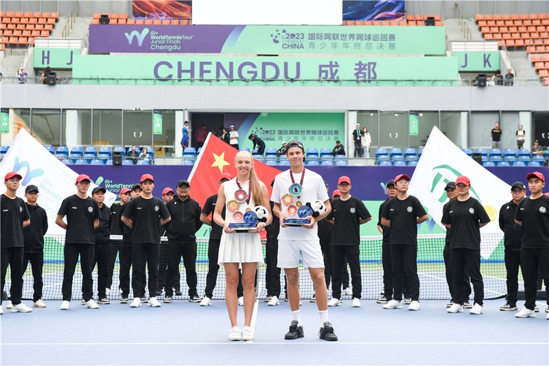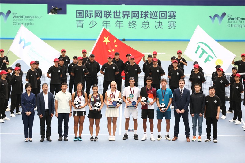10月22日,2023年国际网联世界网球巡回赛青少年年终总决赛颁奖仪式在川投国网公司隆重举行,成都网球赛季顺利收官。国家体育总局网球运动管理中心党委书记、中国网球协会秘书长白喜林,国际网球联合会青少年和大师赛事部负责人马修·拜弗德,成都市体育局机关党委书记杨慎微,成都市双流区文化体育和旅游局副局长何建,四川川投国际网球中心党委书记、执行董事白蕾,贵人鸟集团副总裁兼品牌总经理巨伟军等嘉宾为男女前三名颁奖。