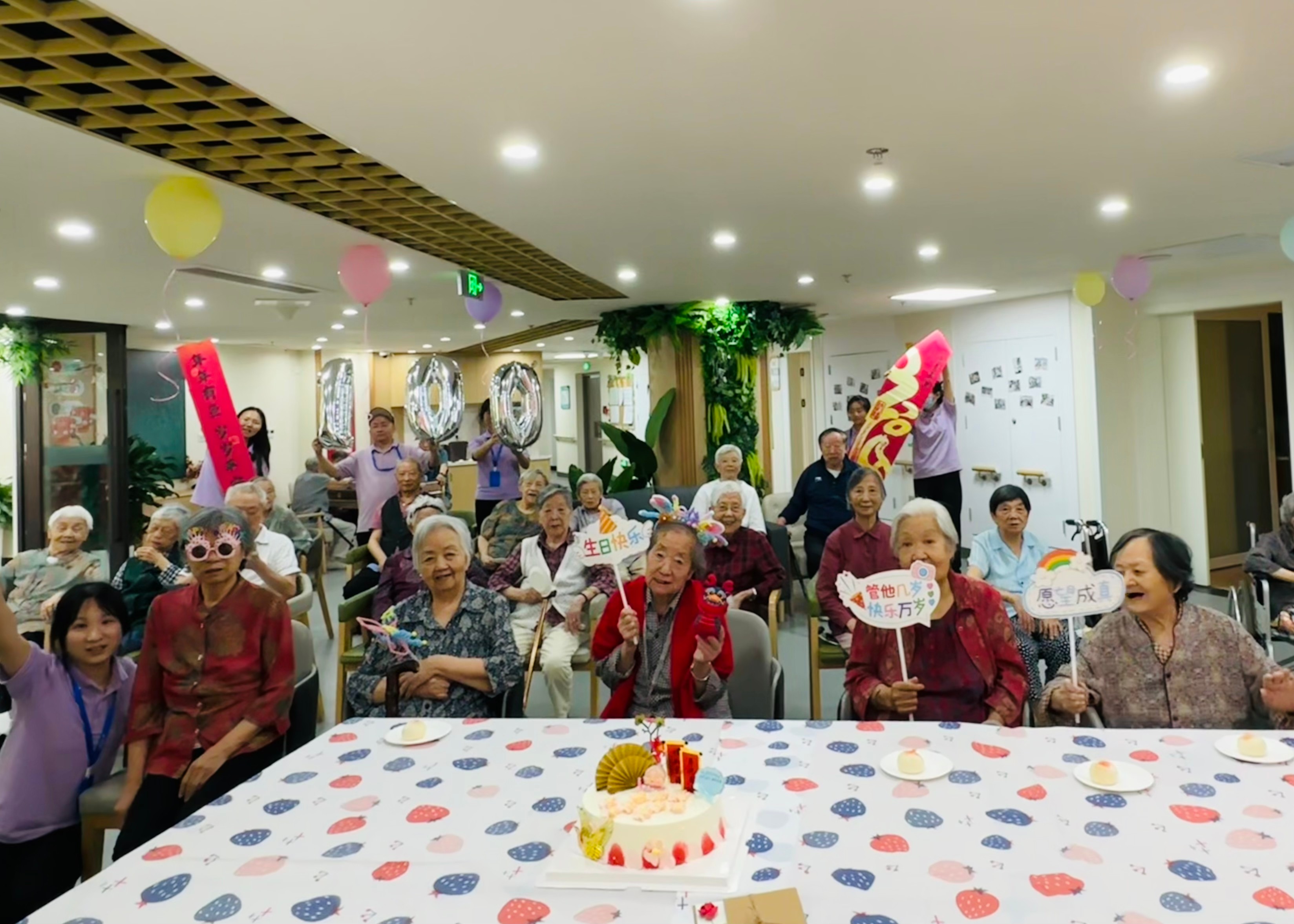 活动当天,机构工作人员精心布置场地,贴福联、打气球,还提前安排了祝寿蛋糕和豆沙寿桃,确保本次生日会活动温馨、愉快。