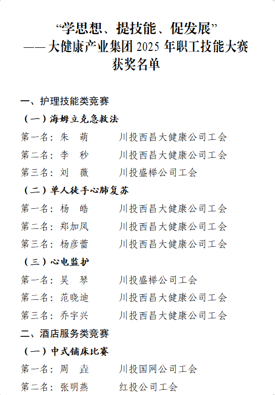 本次技能大赛覆盖了大健康产业集团各版块,聚焦促进企业改革发展和实现职工技能提升,坚持以党建带群团建设,为广大职工提供一个展示技能、提升素质、成长成才的重要平台。经过激烈角逐,8个项目中的24名参赛选手斩获奖项,各项目排名第一的选手被授予大健康产业集团2025年“技能先锋”荣誉称号;排名第二的选手被授予大健康产业集团2025年“技能标兵”荣誉称号;排名第三的选手被授予大健康产业集团2025年“岗位能手”荣誉称号。