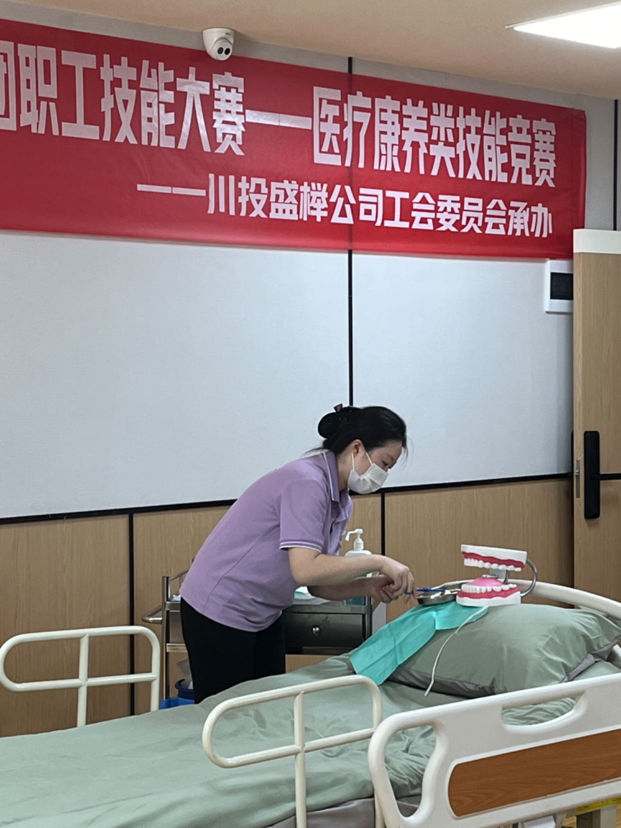 此次技能大赛医疗康养类项目包括口腔护理操作、海姆立克急救法等2项比赛项目及多种急救技术的科普展示,经过前期基层工会进行预赛选拔,比赛现场,来自川投盛榉公司3所养老机构的的6名选手以及来自川投西昌医院急诊科、护理部的3名选手分别进行了两个比赛项目的最终角逐。